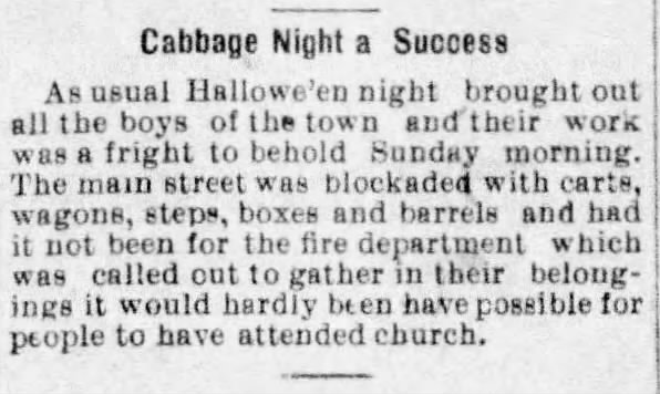While youngsters around the country were scaring people with carved turnips, smoking people out of their homes with burning cabbage stalks, putting livestock on barn roofs, and tipping outhouses on what was variously known as Gate Night or Mischief Night, Vermont kids (mostly boys) were celebrating our state’s version: Cabbage Night.