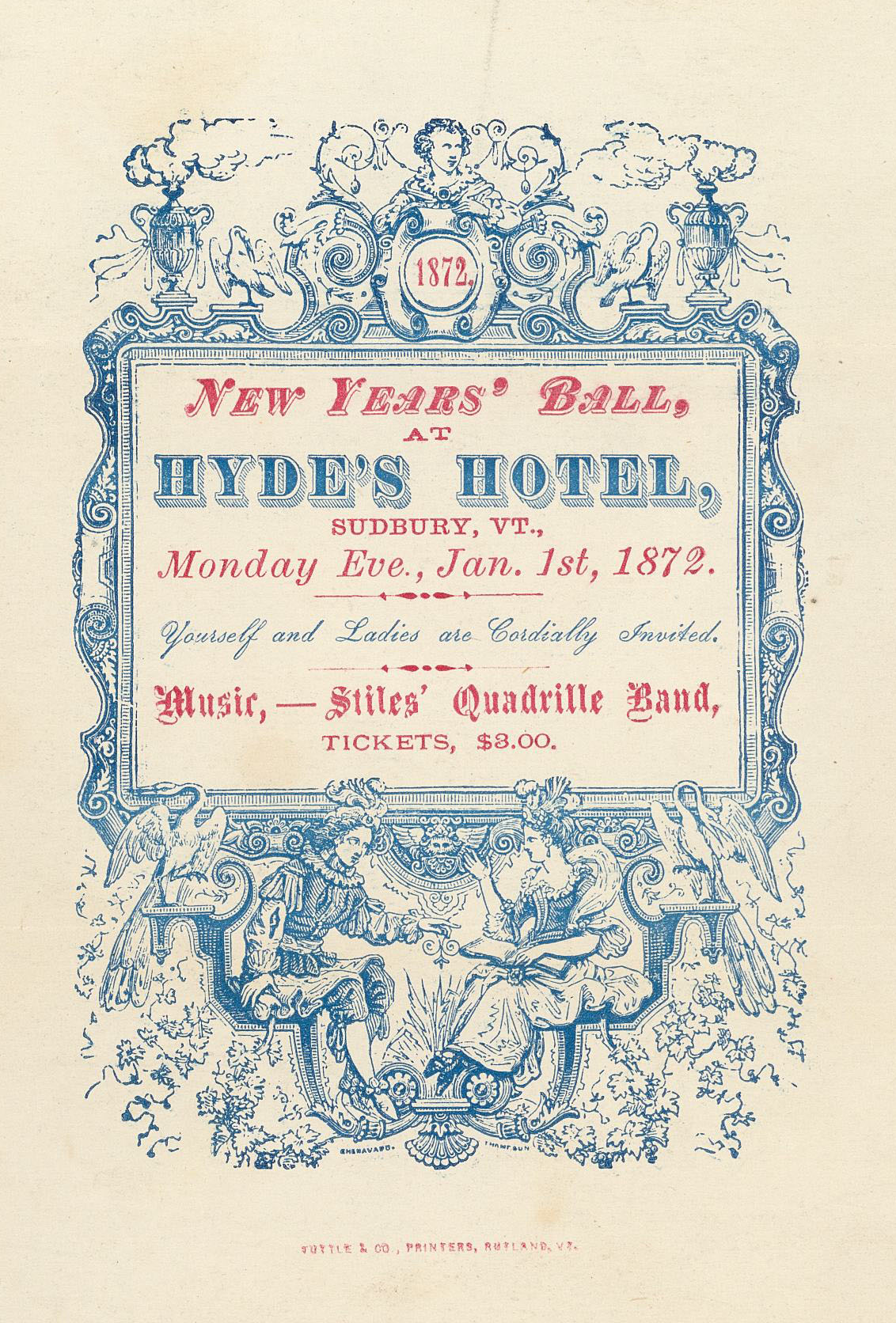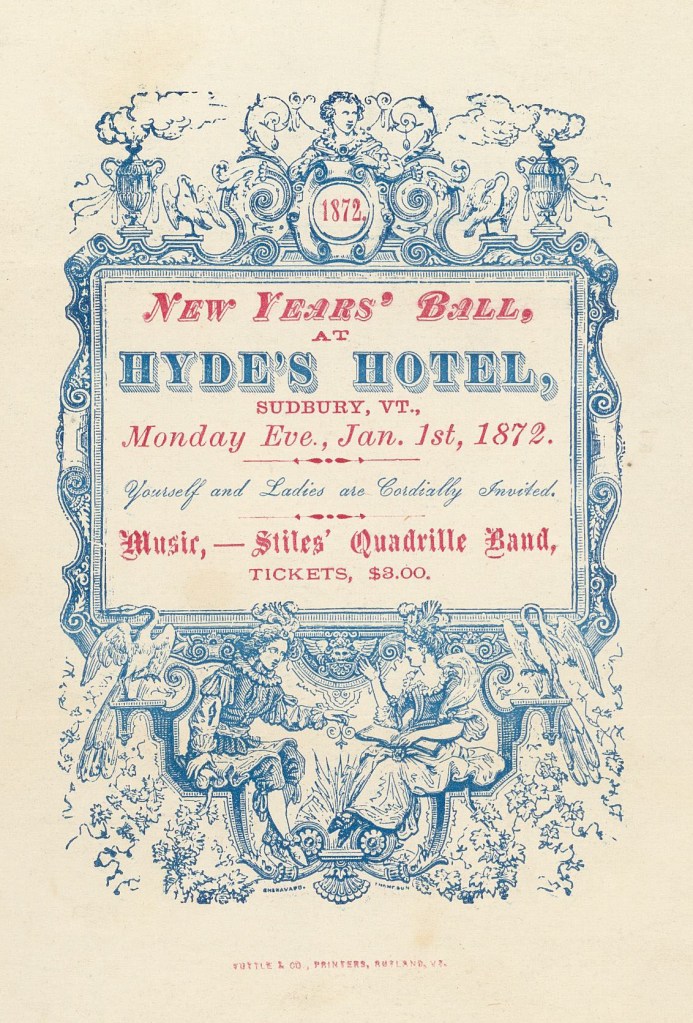 While private by-invitation-only balls and parties had been held earlier in the century – such as the ball held on Christmas Day, 1806 at Hyde’s Hall in Castleton – ticketed events open to the public weren’t generally known until mid-century. In fact, the first (known) advertised Christmas ball was in 1858. It was one of five “Anniversary Balls” listed in the Middle Register on December 15th, 1858 to be held at Hyde’s Hotel in Sudbury. (Some may recall the huge tumbling-down mansion on Route 30 just north of Hubbardton. This was the once-grand Hyde’s Hotel, or as it was renamed in the late 19th century, Hyde Manor.)